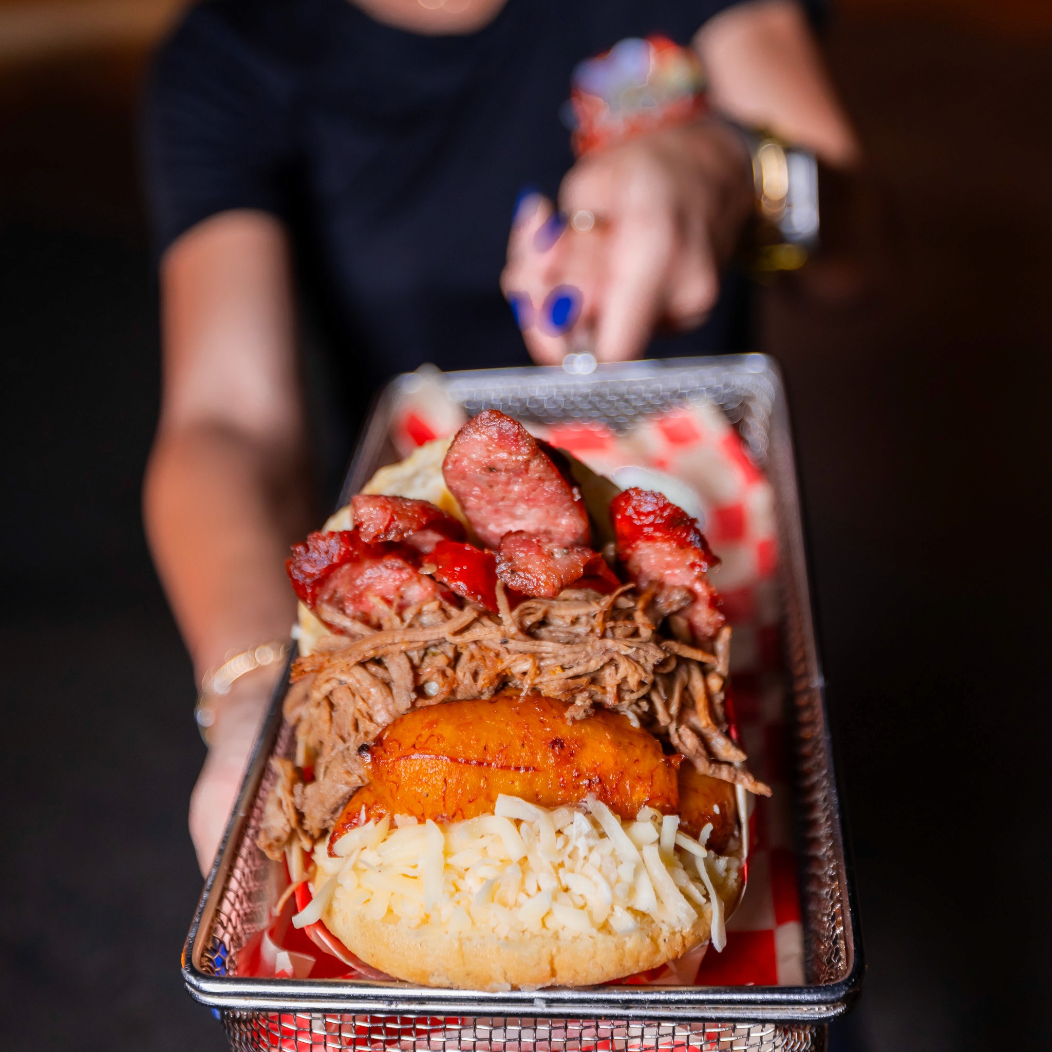 Reina Pepiada Tocineta Queso amarillo Plátanos Maduros